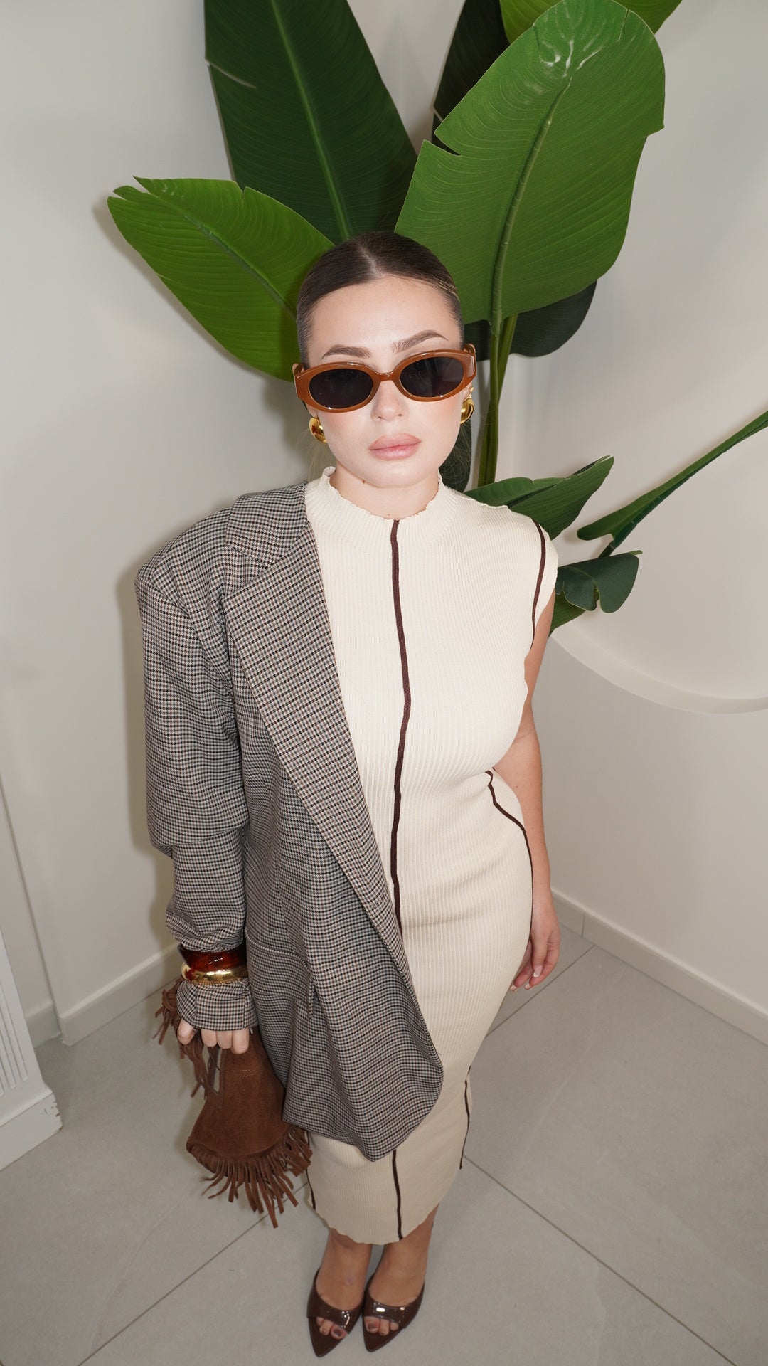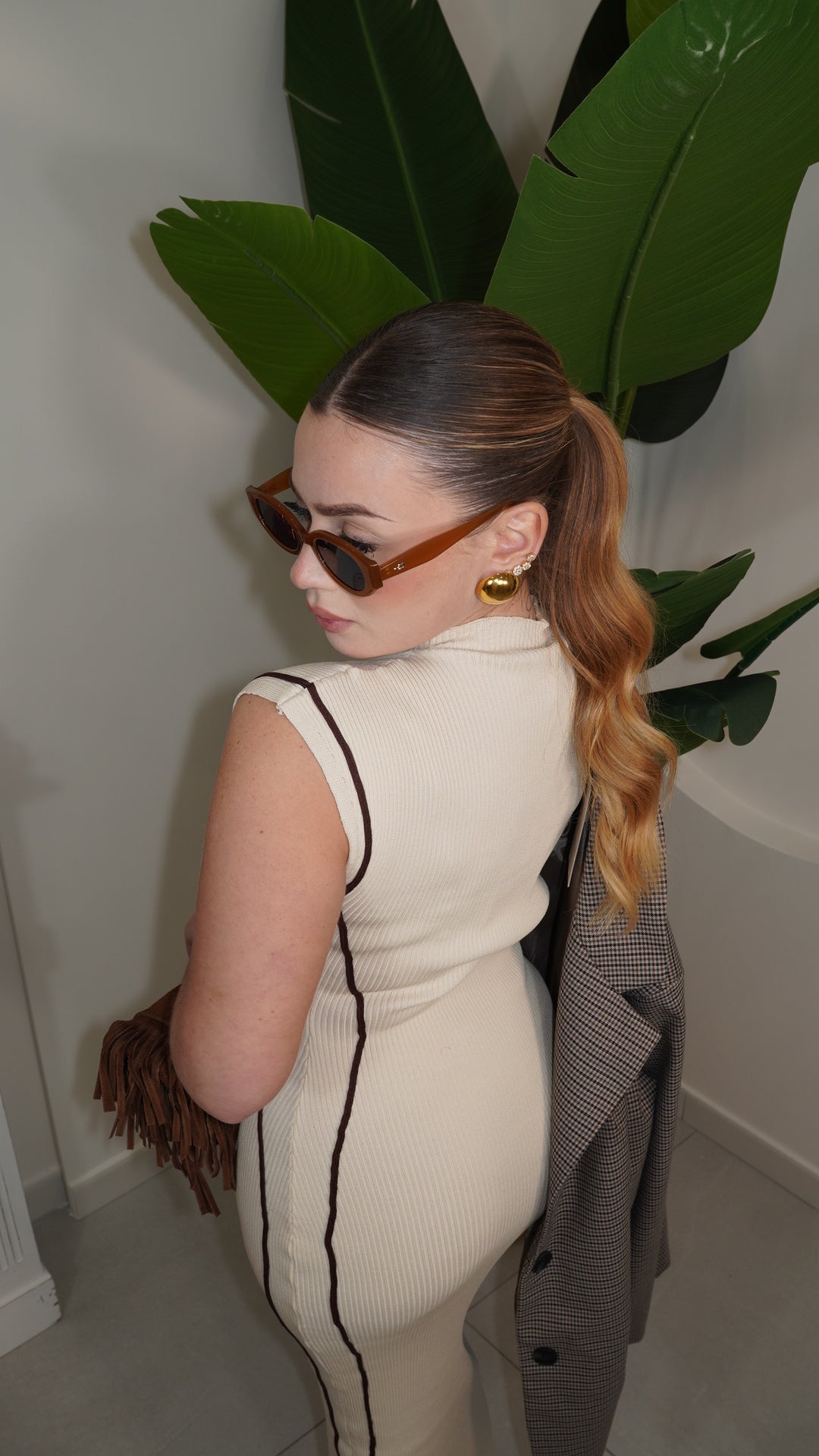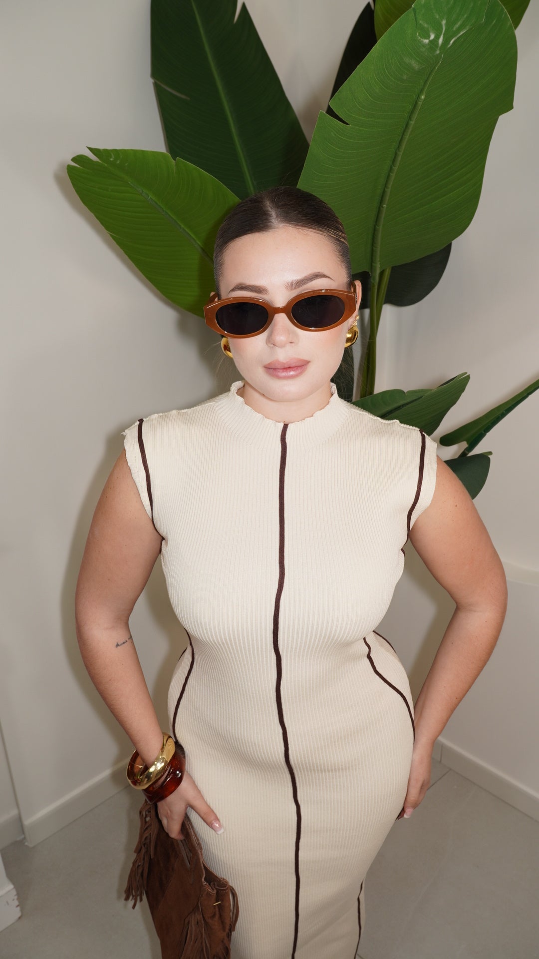 Abito in taglia unica a costine aderente e elasticizzato, lunghezza MIDI giromanica e mezzo collo unica variante di colore con dettaglio Righini a contrasto di colore che delinea la silhouettes