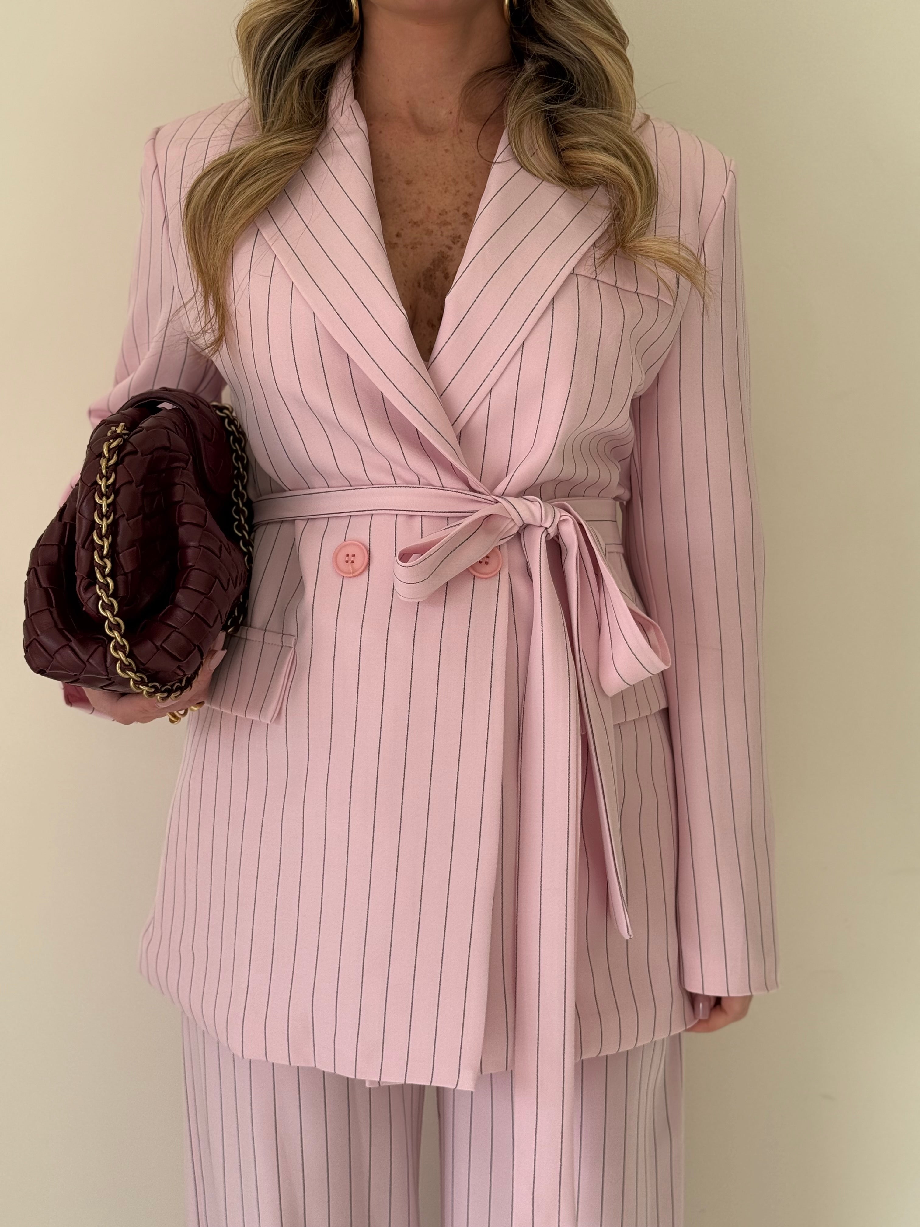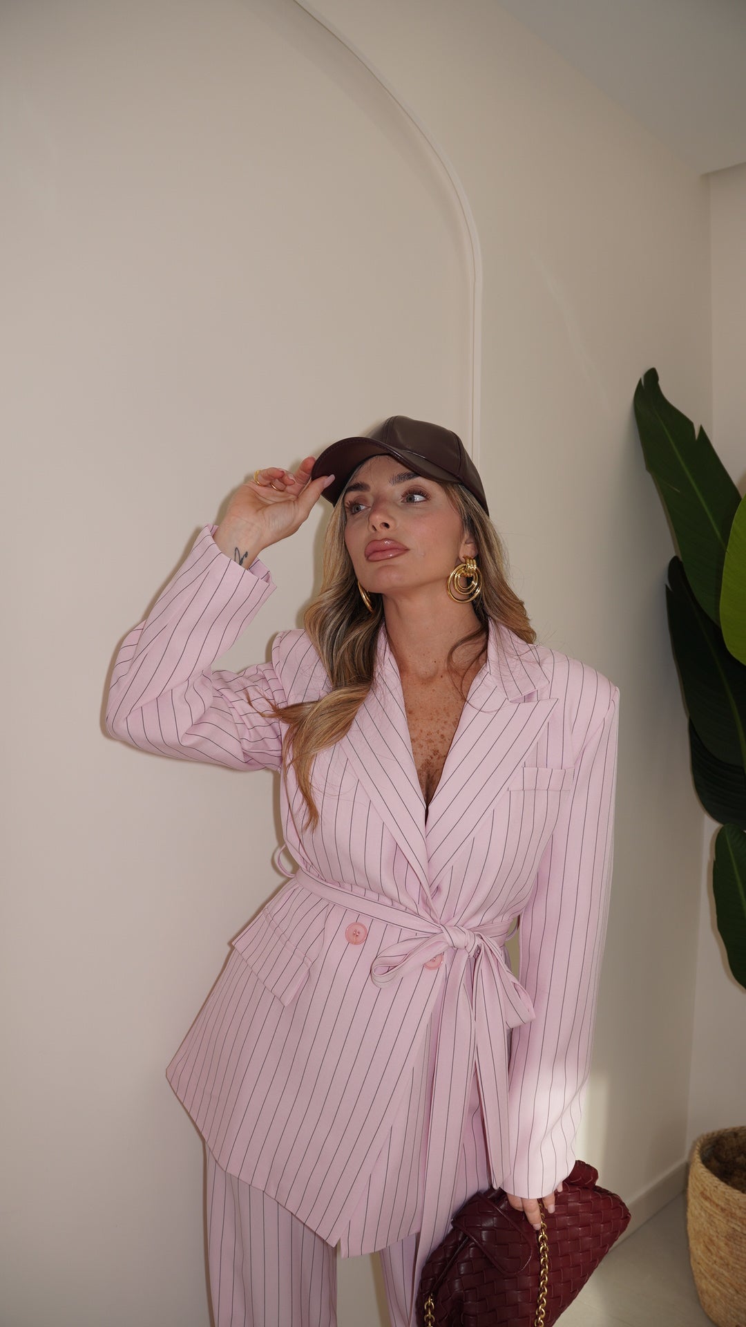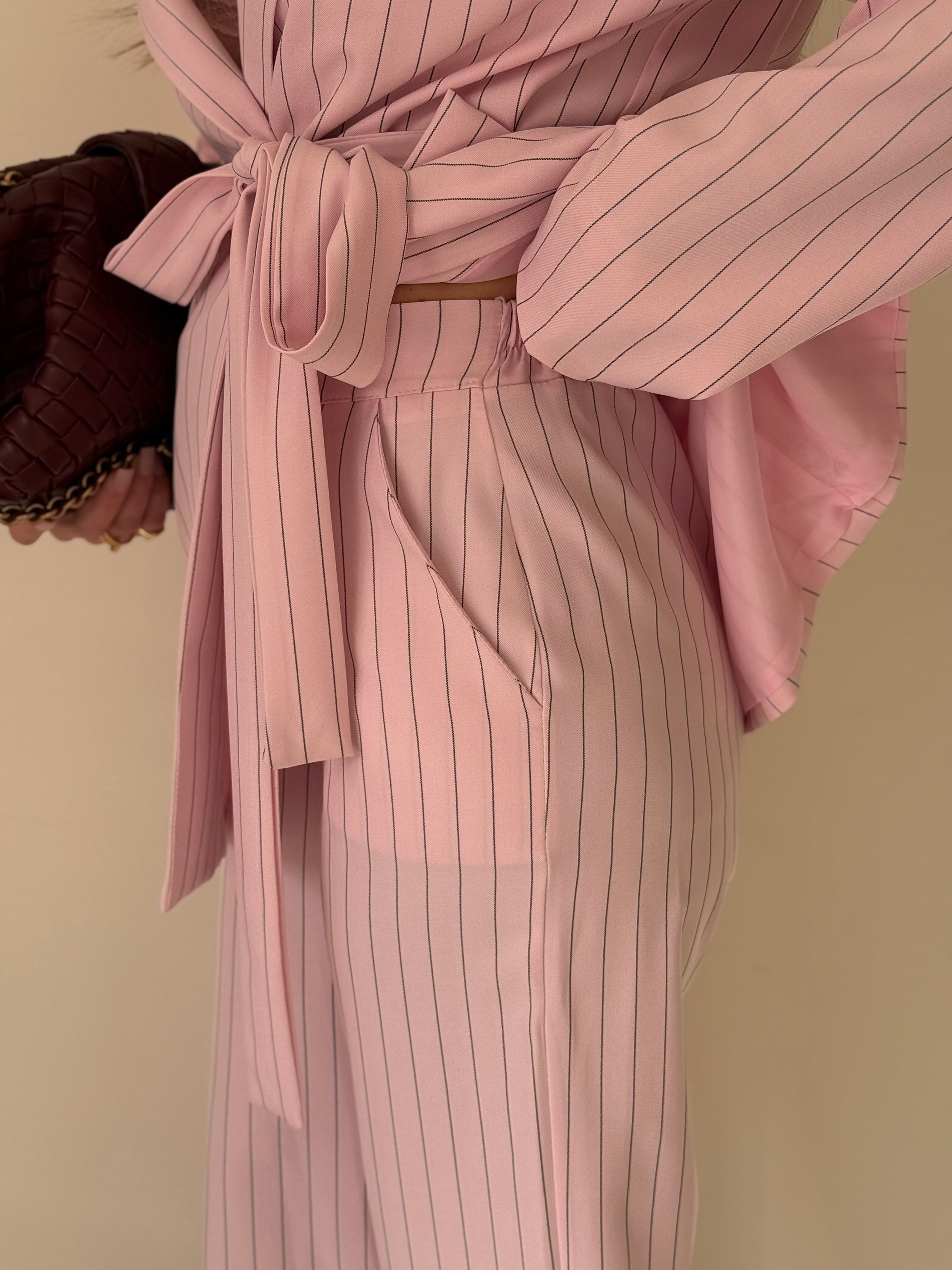 chiusura con bottoni frontali doppio petto compreso di cintura pantalone vita alta con elastico sul retro e bottone frontale gamba dritta