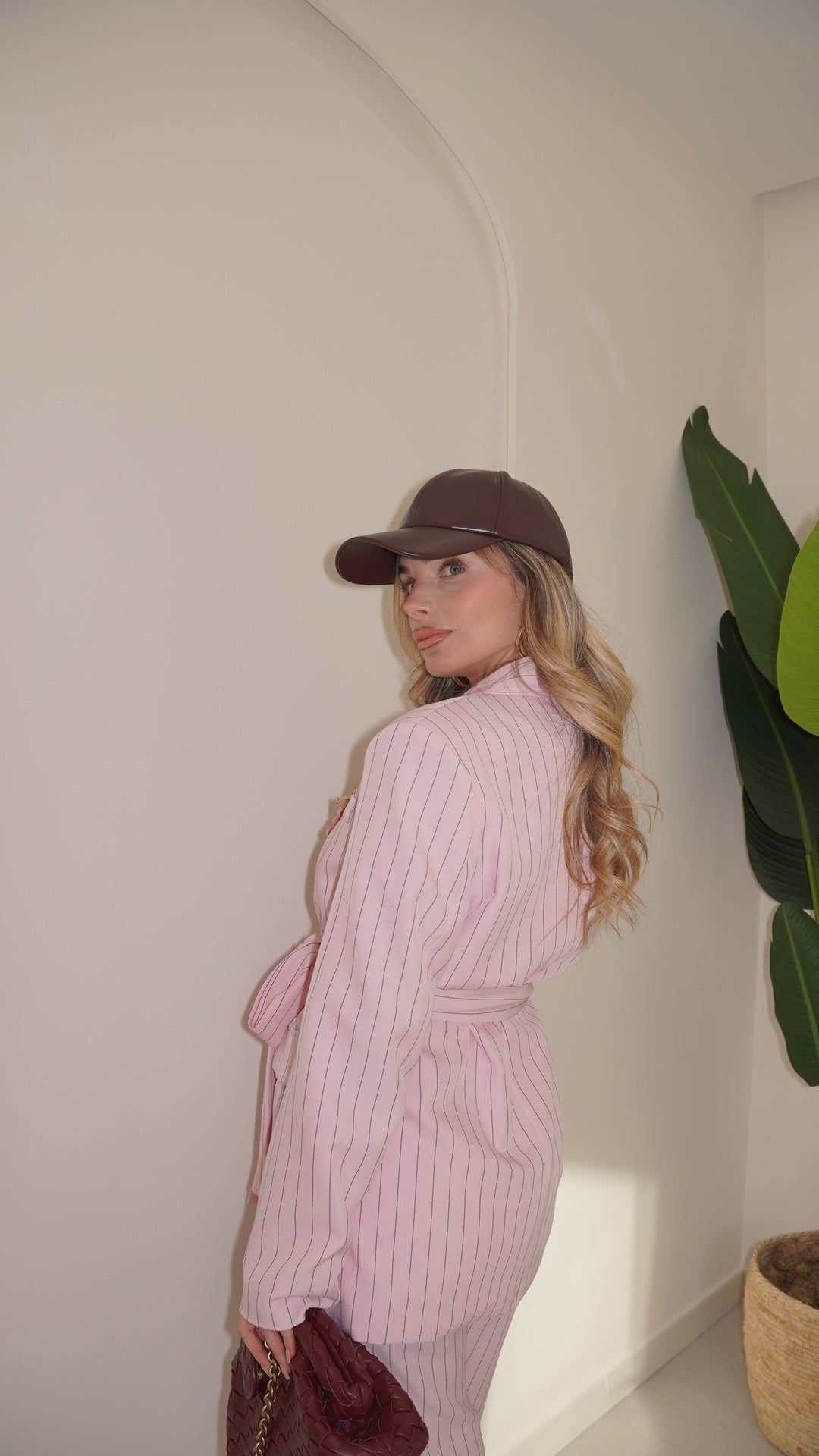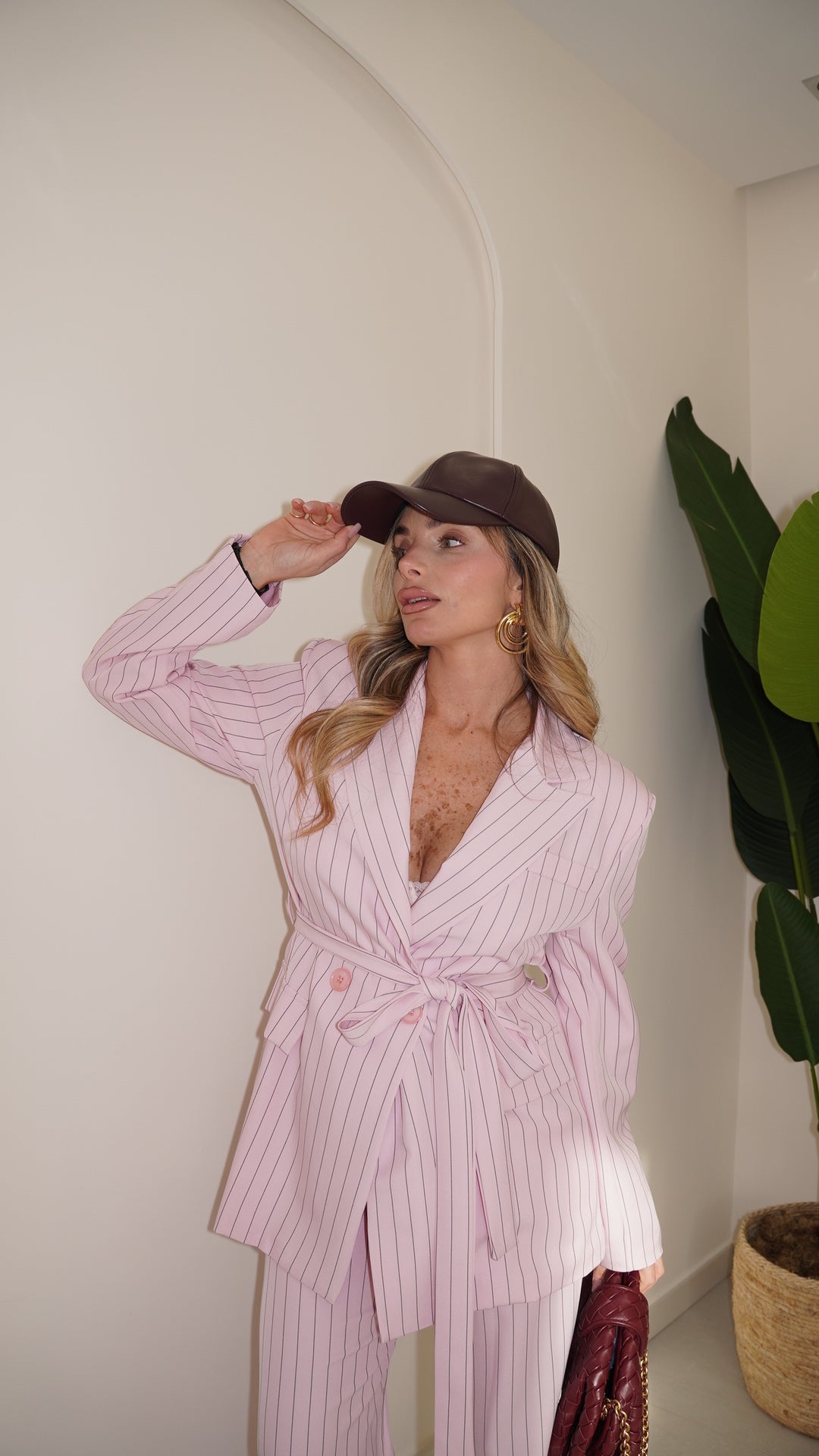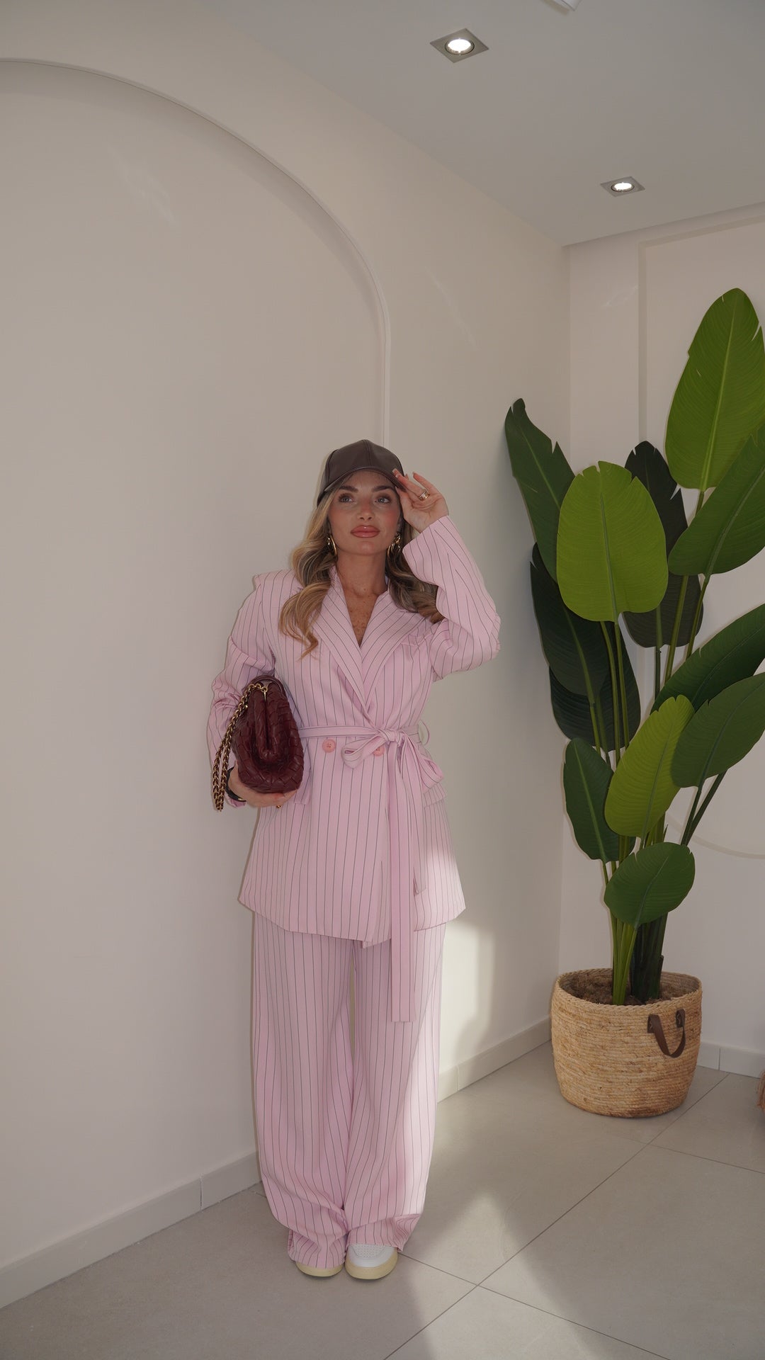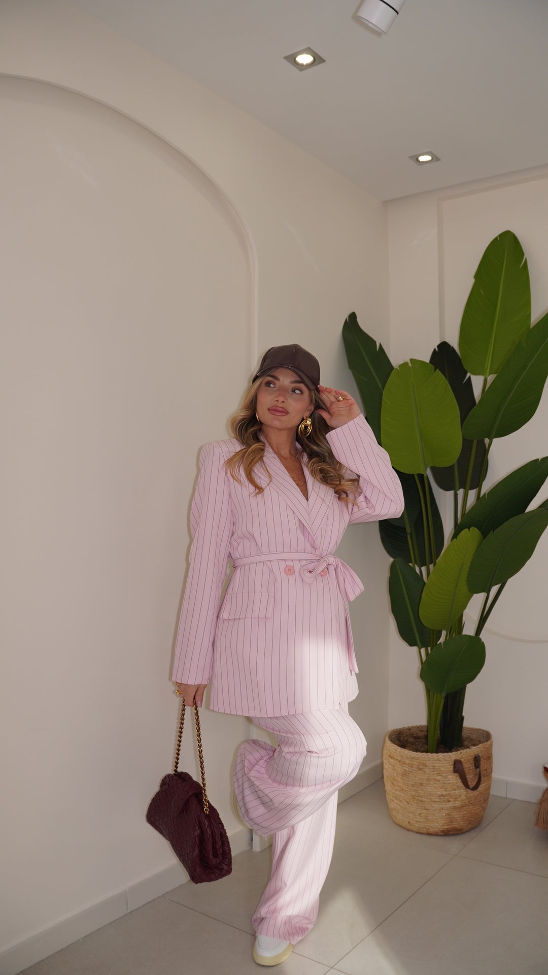 chiusura con bottoni frontali doppio petto compreso di cintura pantalone vita alta con elastico sul retro e bottone frontale gamba dritta