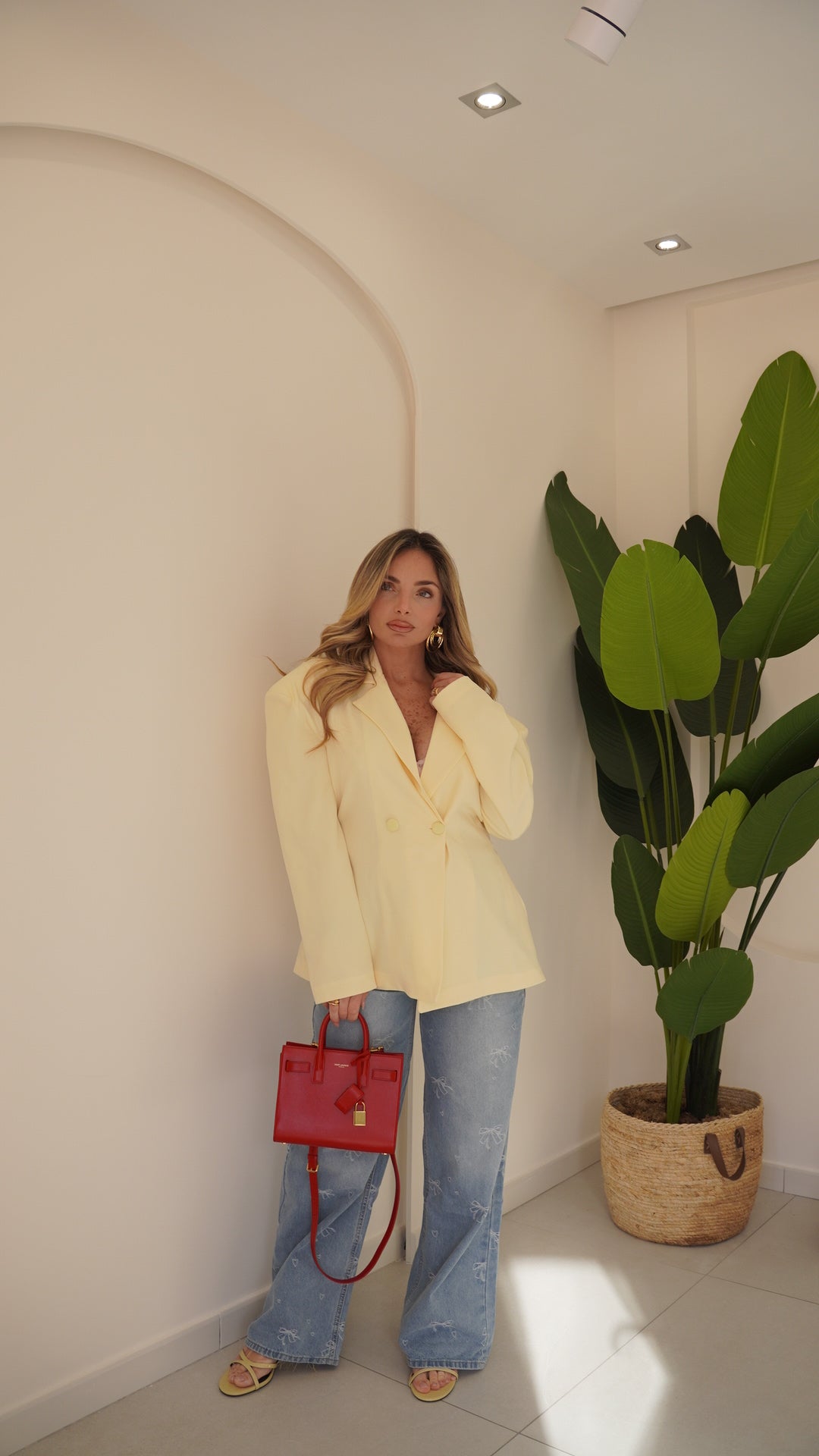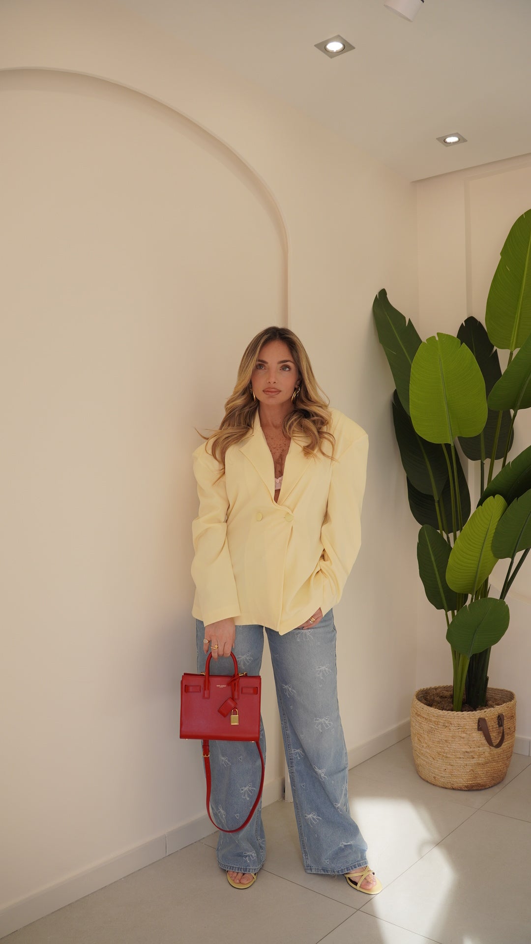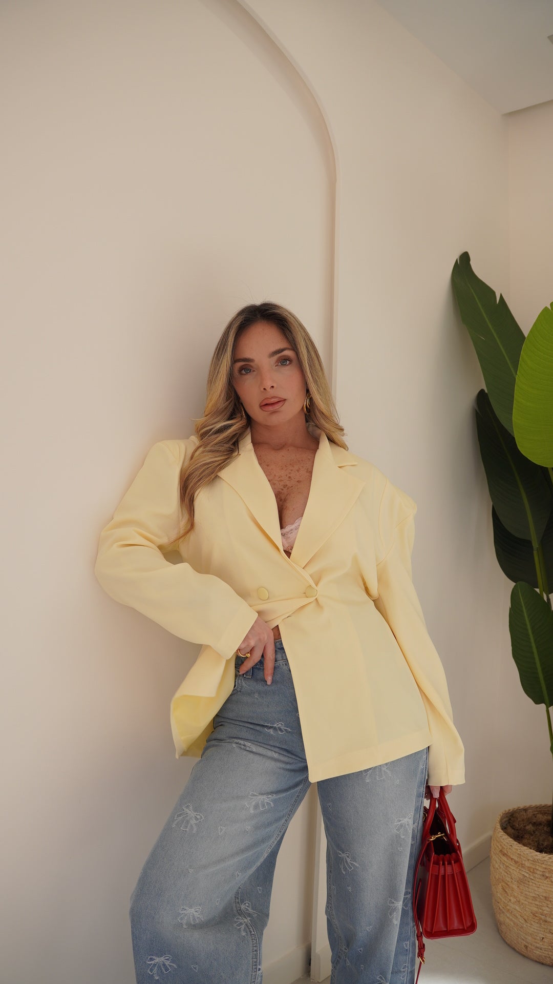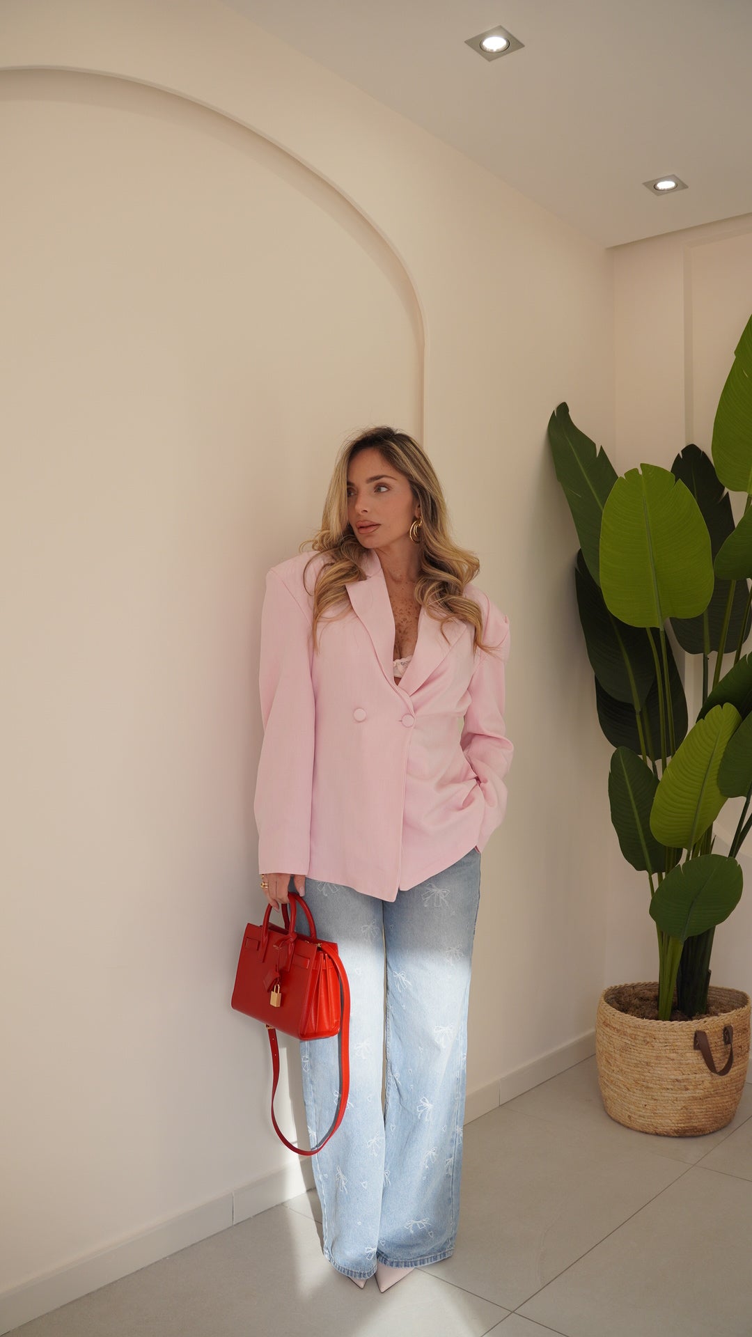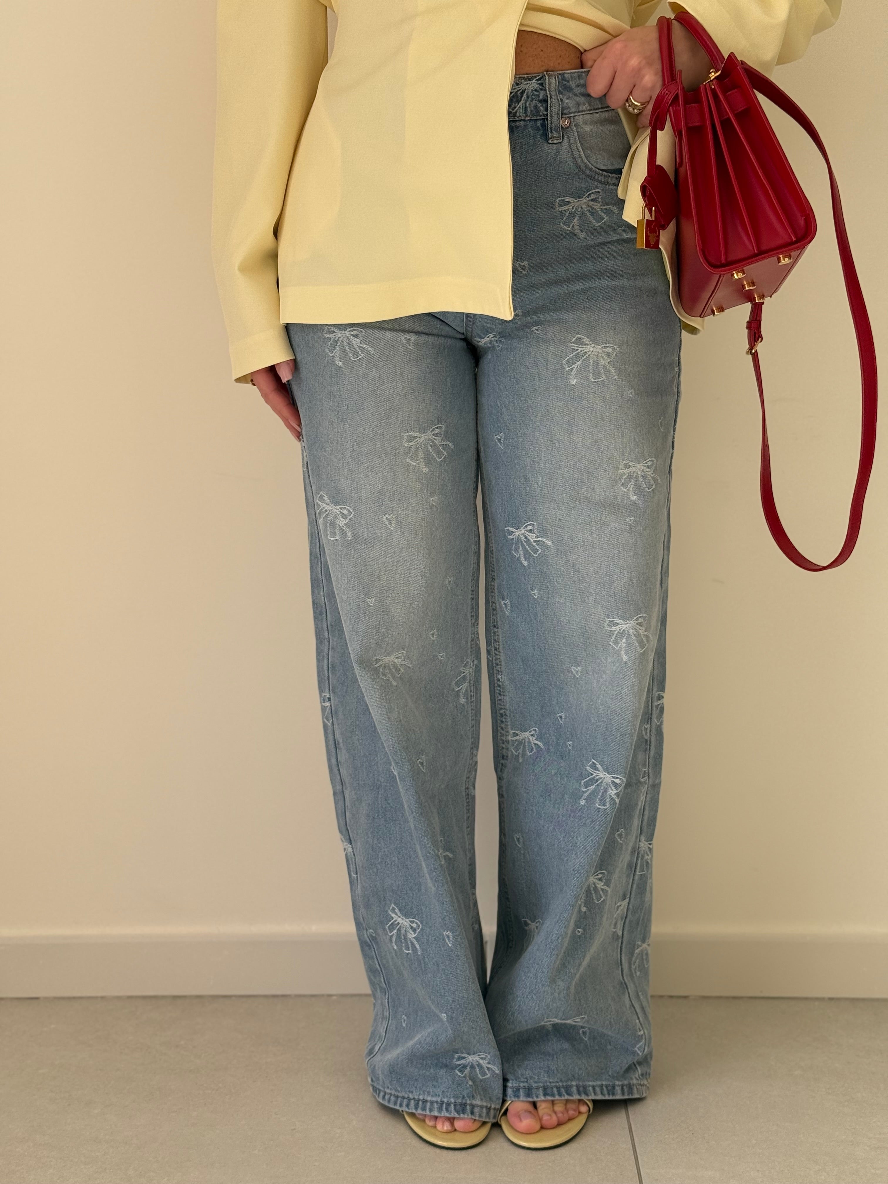 Jeans vita media lavaggio chiaro,quattro tasche gamba diritta chiusura frontale con cerniera e bottone metallico Impreziosito con fiocchi realizzati in tessuto bianco