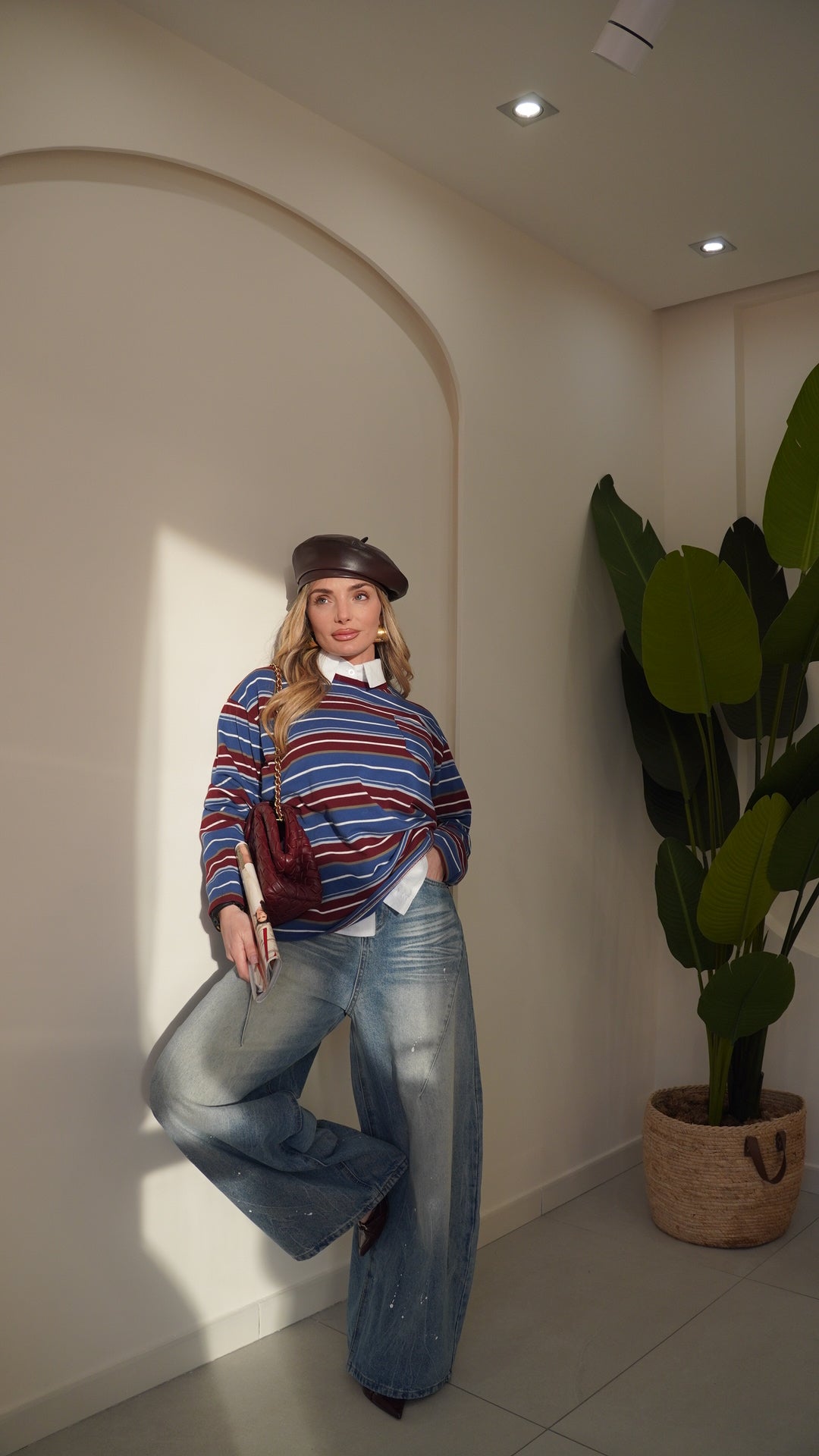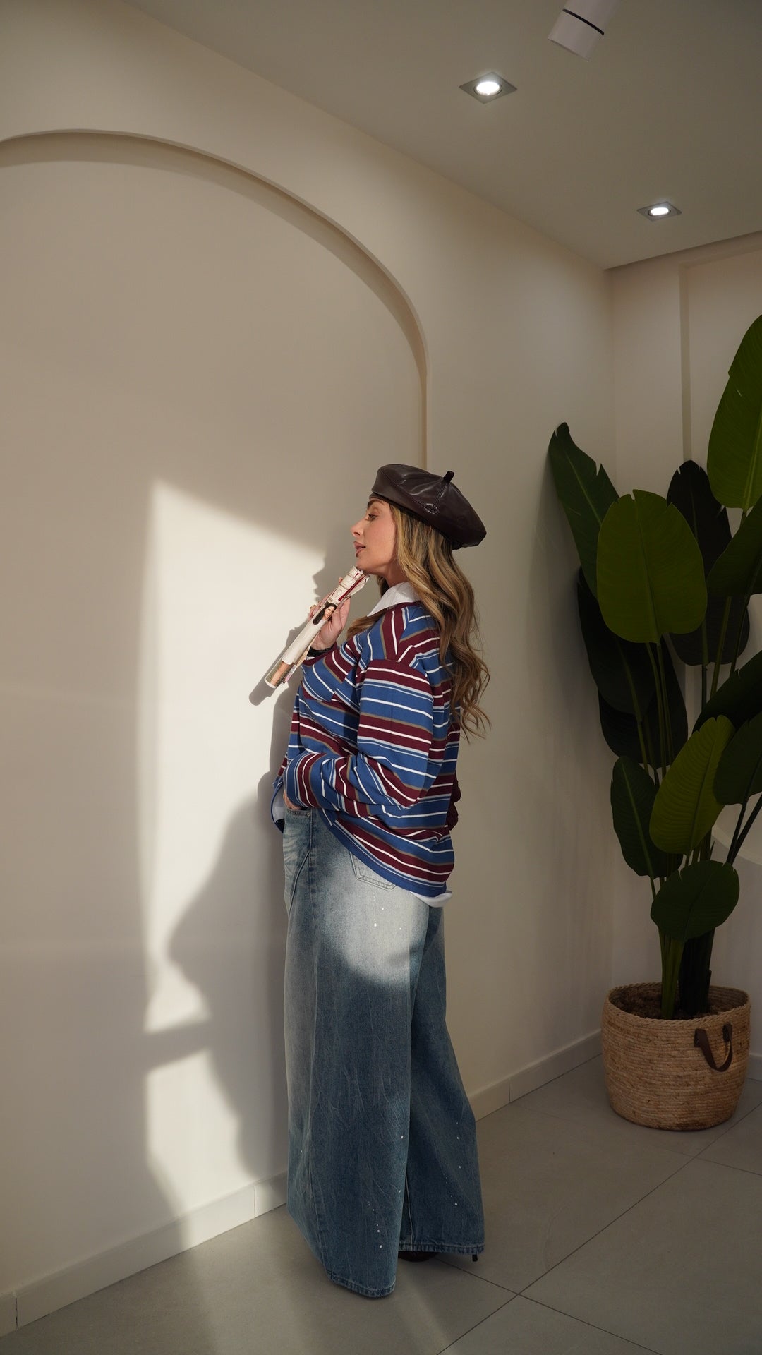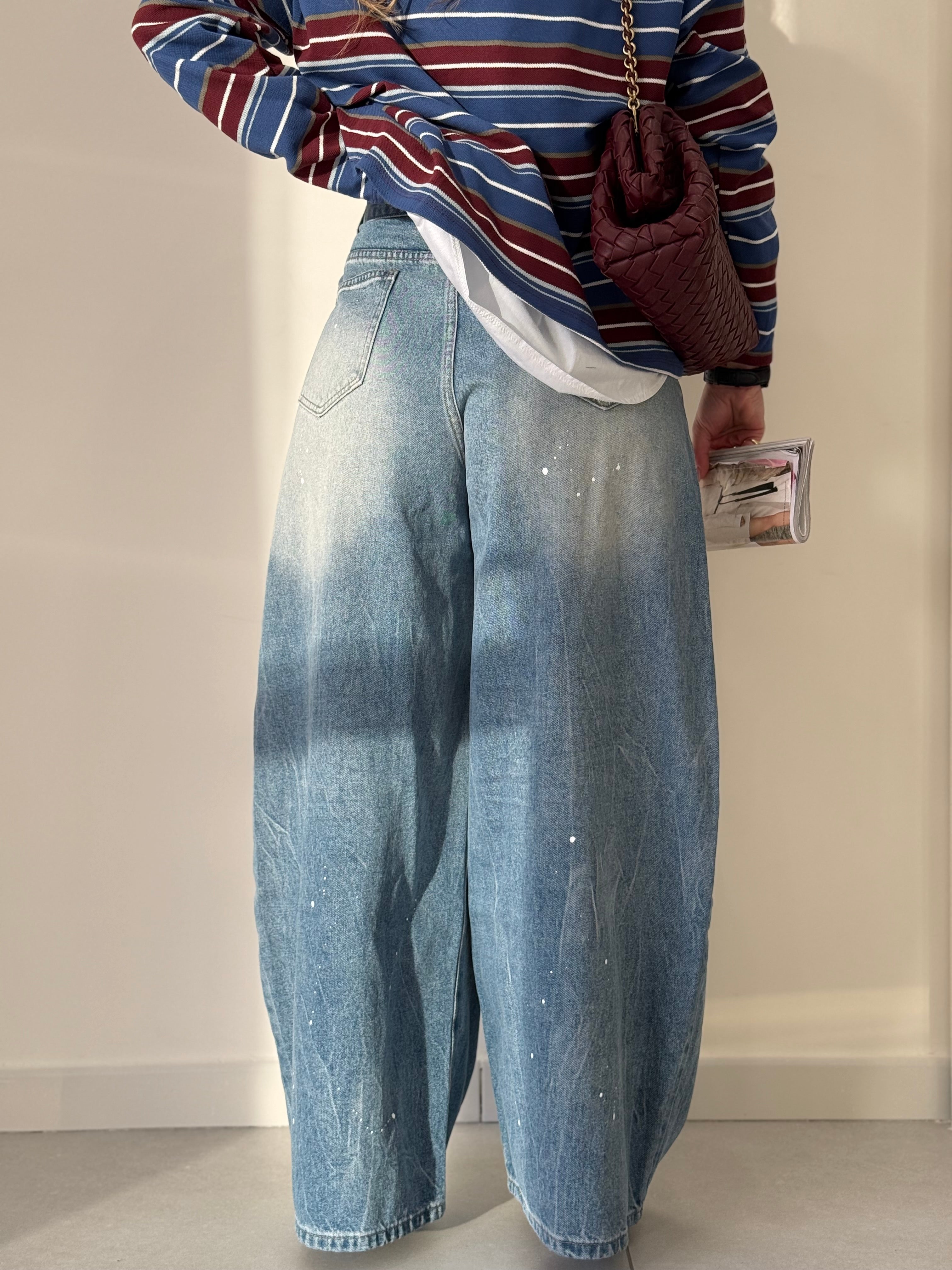 jeans ampio vita alta  lavaggio medio con sfumature all’interno a contrasto di colore gamba larga