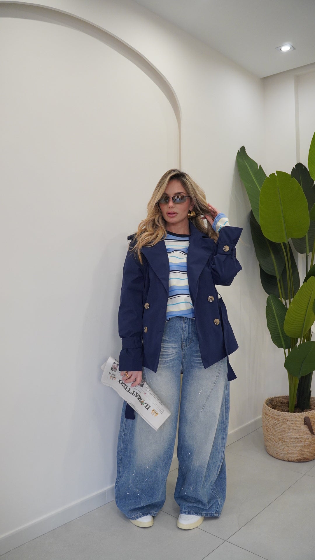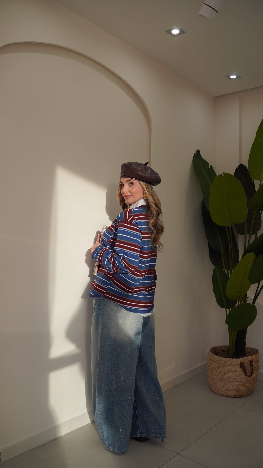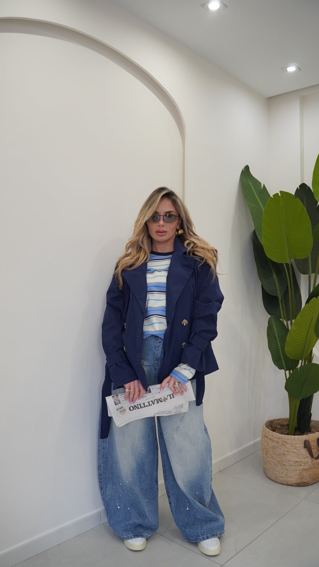 jeans ampio vita alta  lavaggio medio con sfumature all’interno a contrasto di colore gamba larga