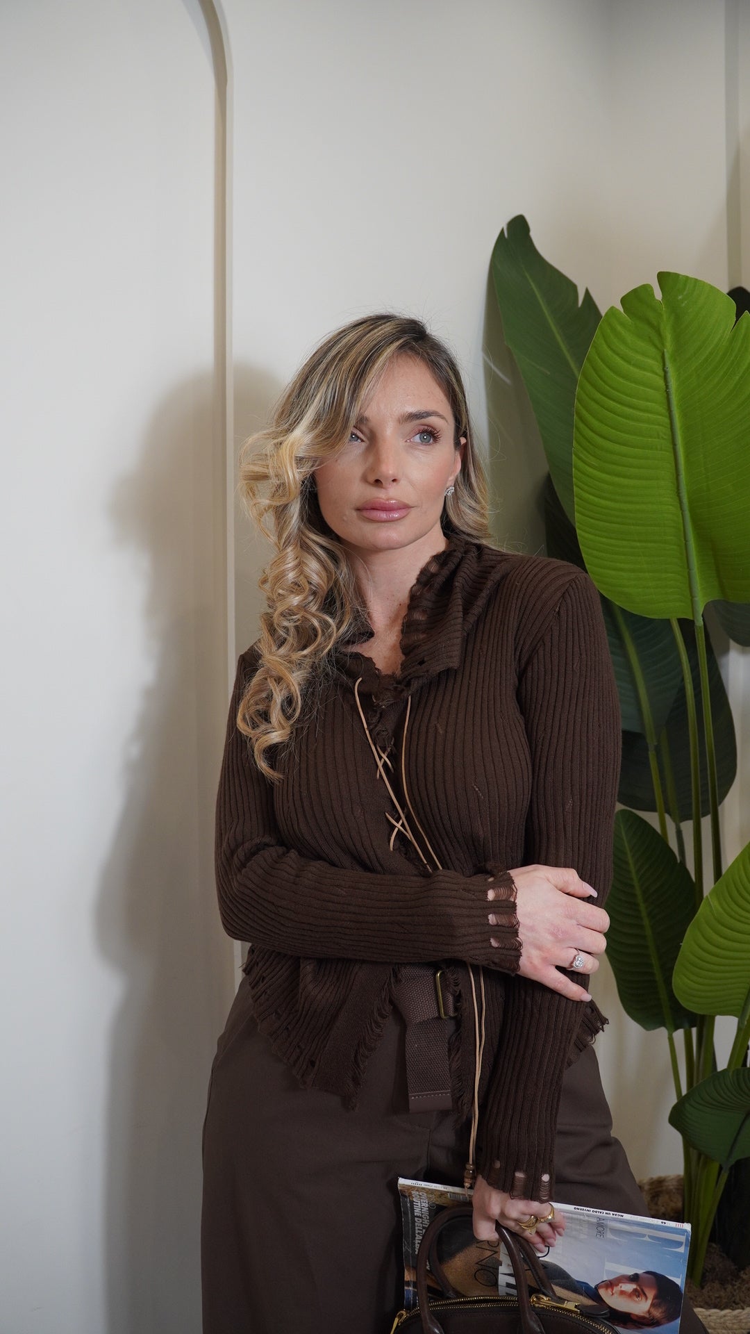 Maglia aderente ed elastica taglia unica a costine con colletto a reverse e dettagli sfrangiati sul collo e sul fondo chiusura frontale con laccio regolabile