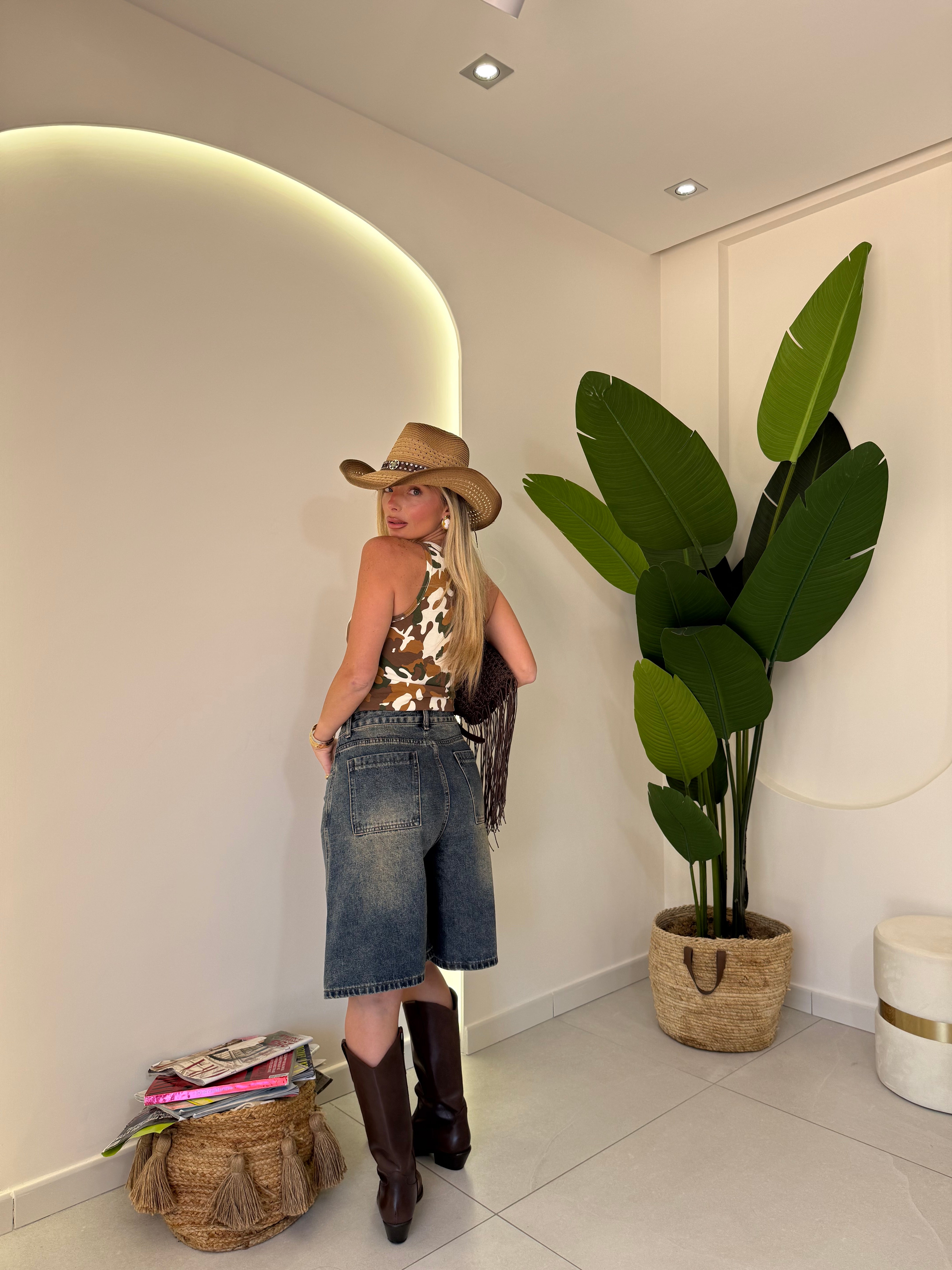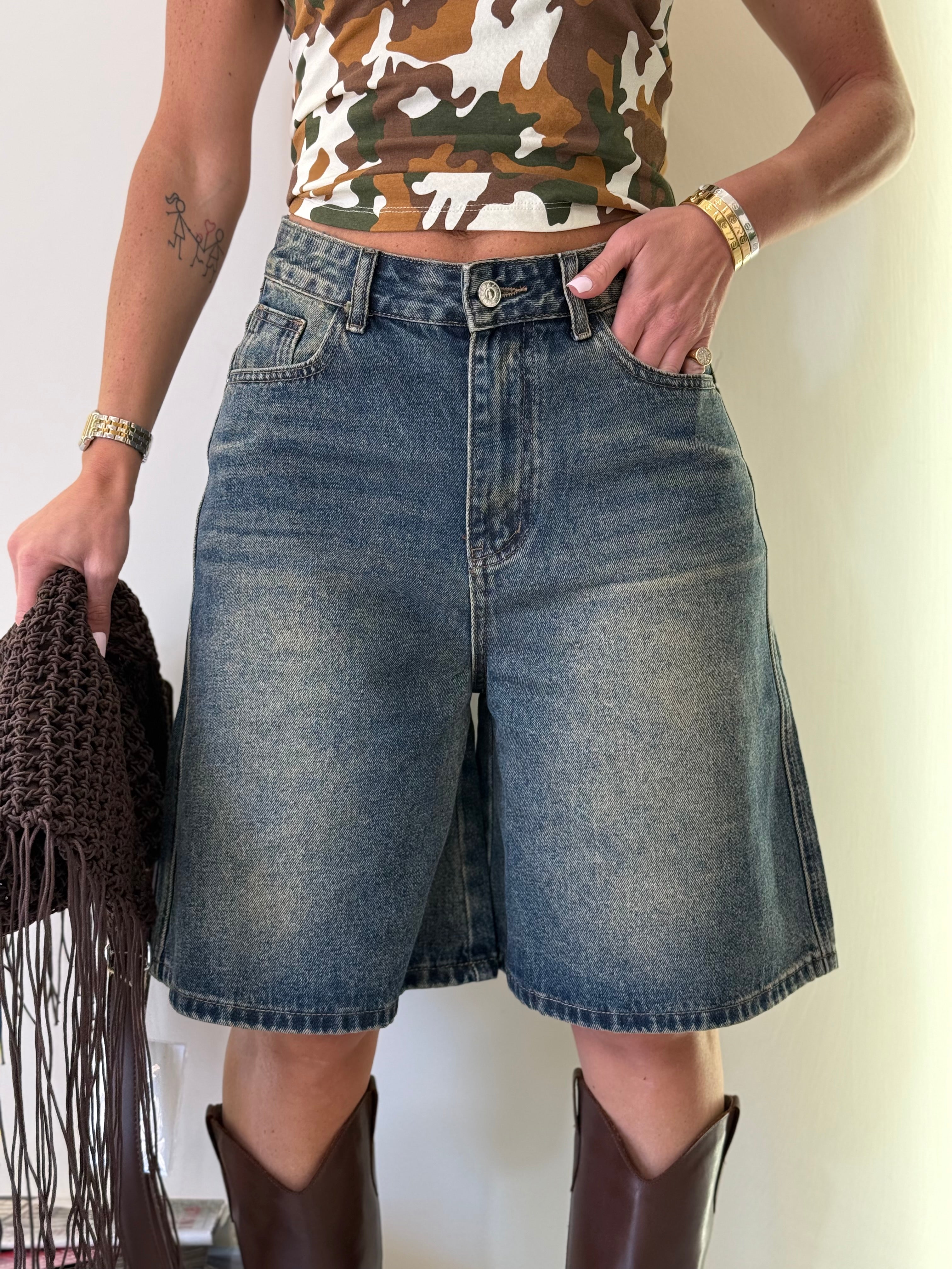 Bermuda in Denim, lavaggio slavato, gamba ampia, tasconi sia sul retro che ambo i laterali sul davanti