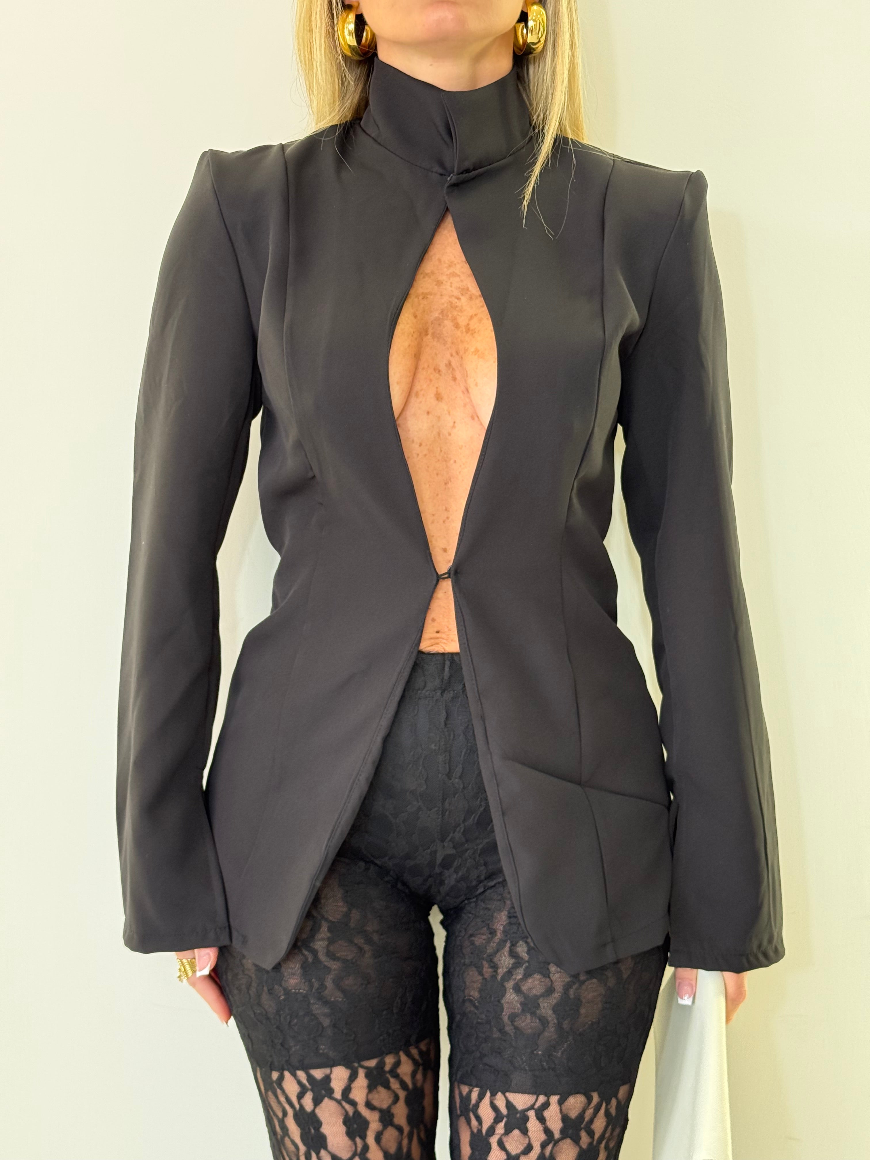 Blazer taglia unica con chiusura colletto coreano,scollo profondo e chiusura frontale con ,spalline incorporate
