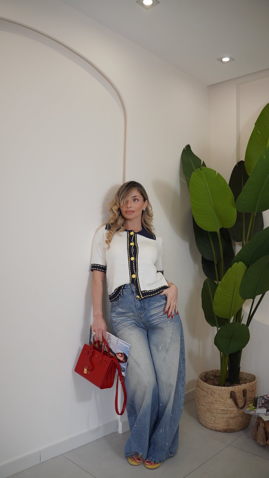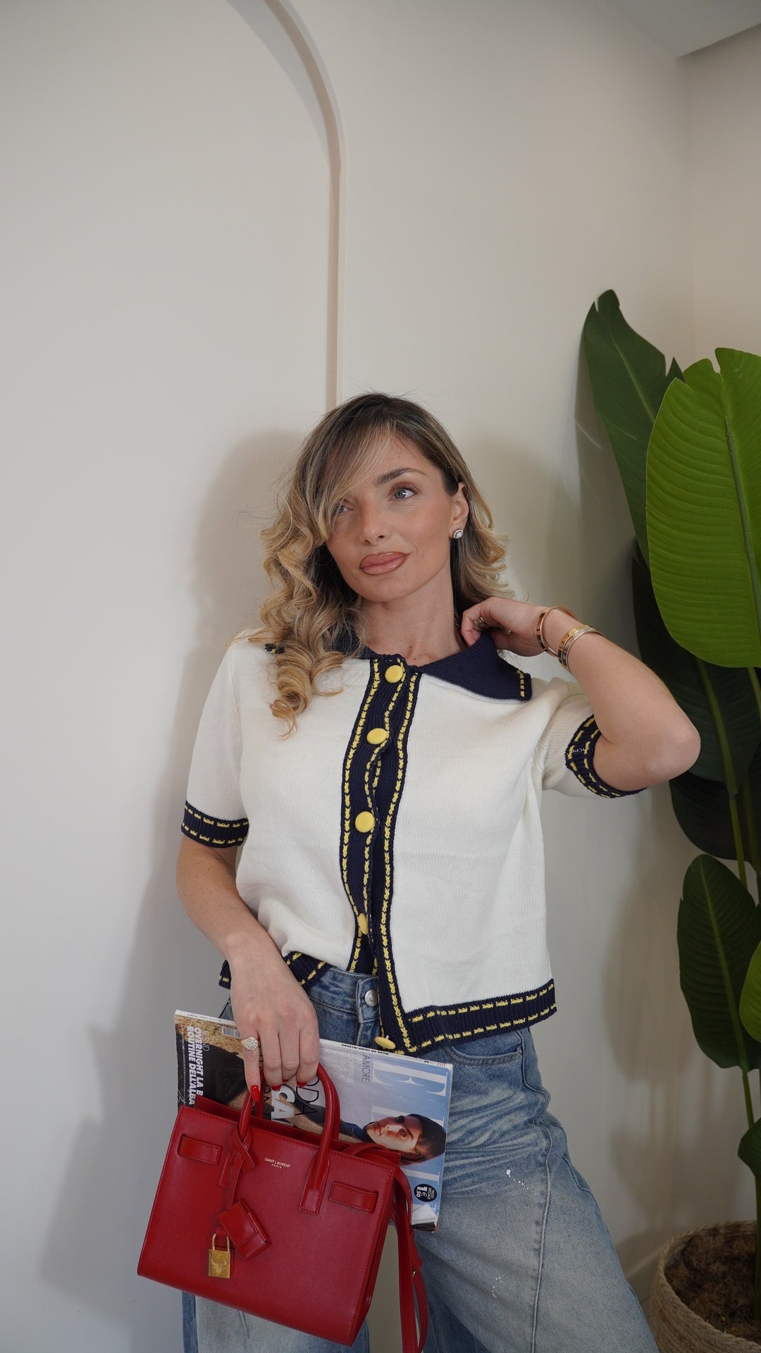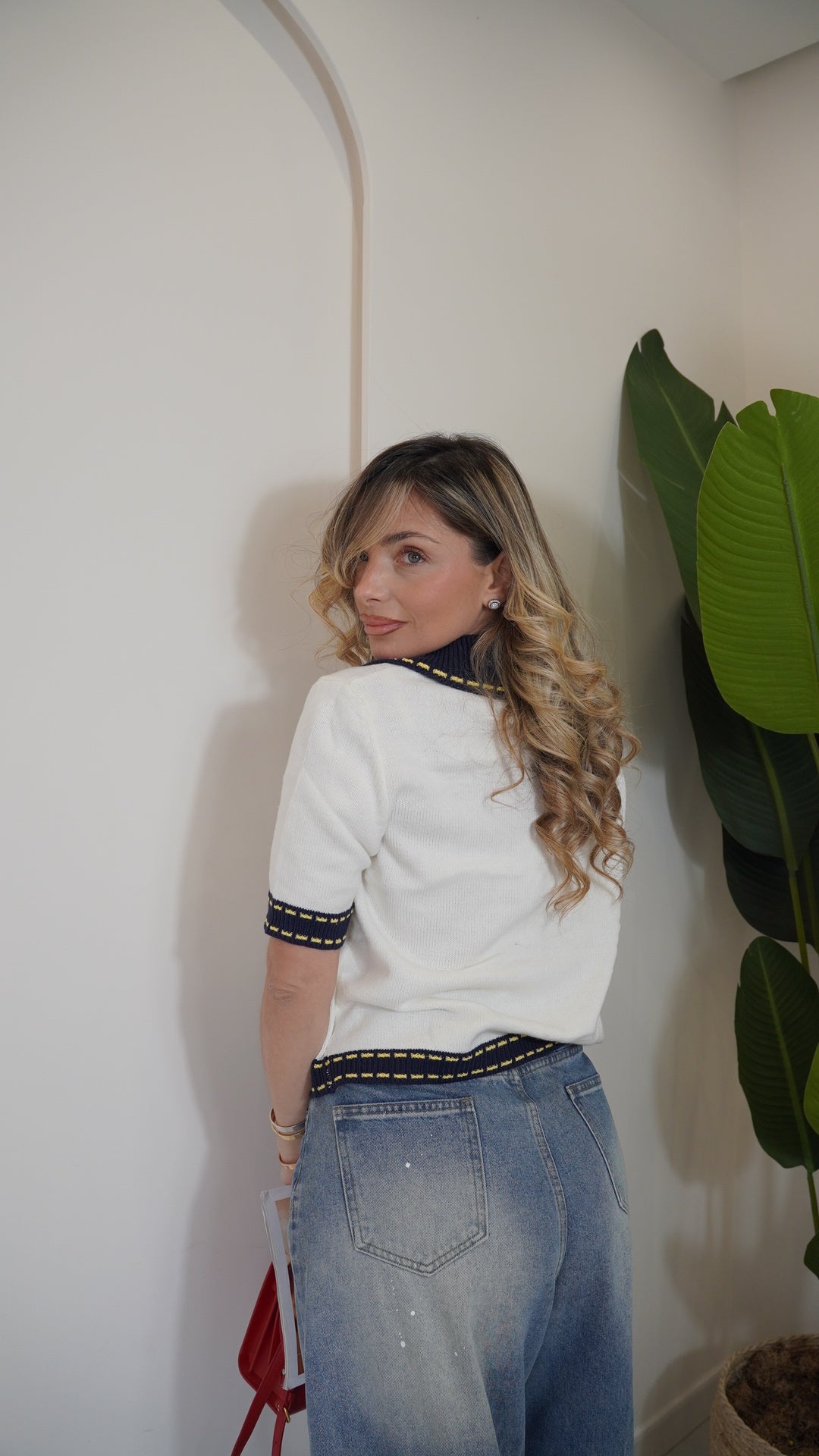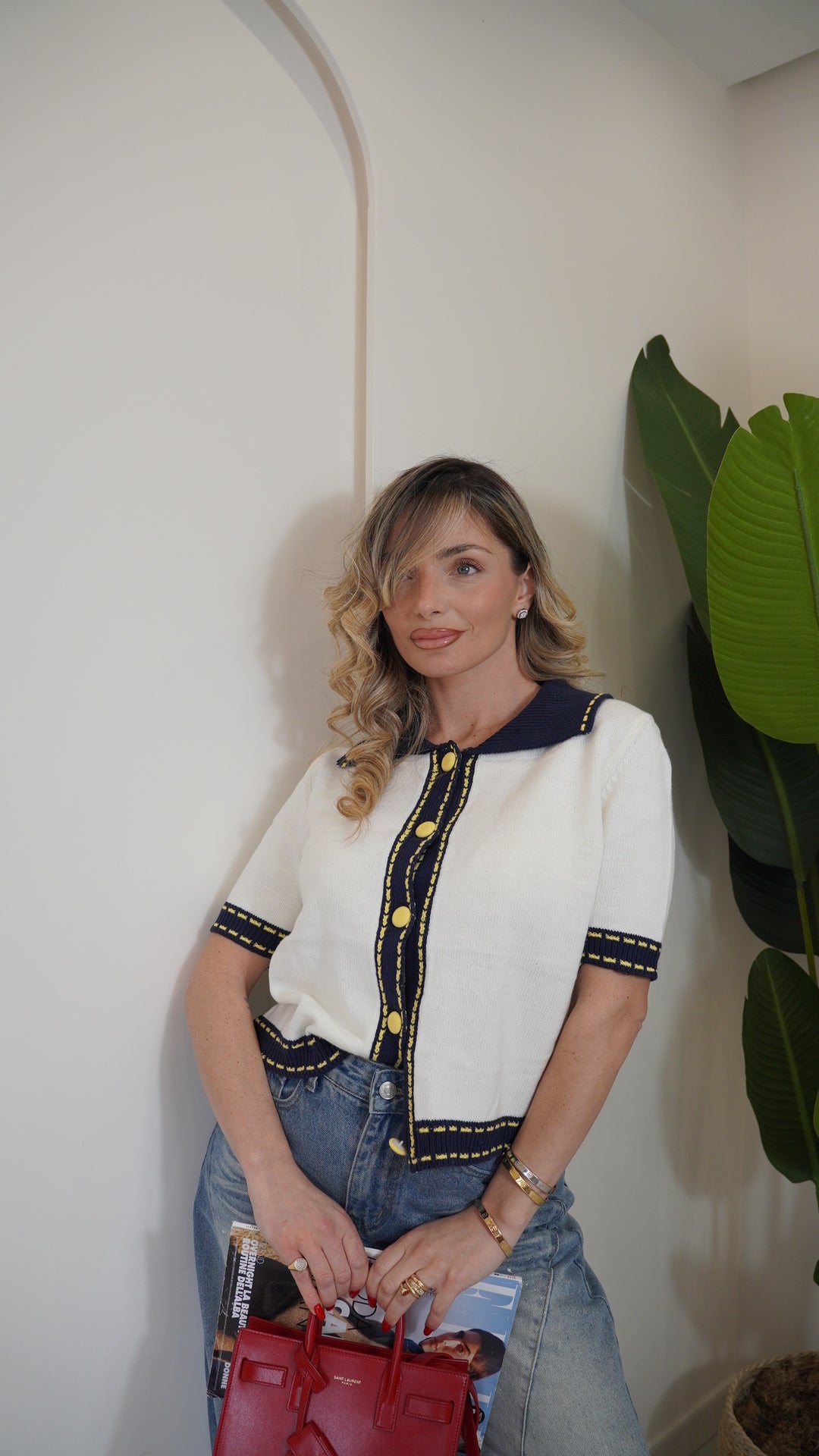 Maglia in filo mezza manica taglia unica con colletto a contrasto in maglia a costine chiusura frontale con bottoni tono su tono a contrasto la taglia unica può vestire da una s ad una L