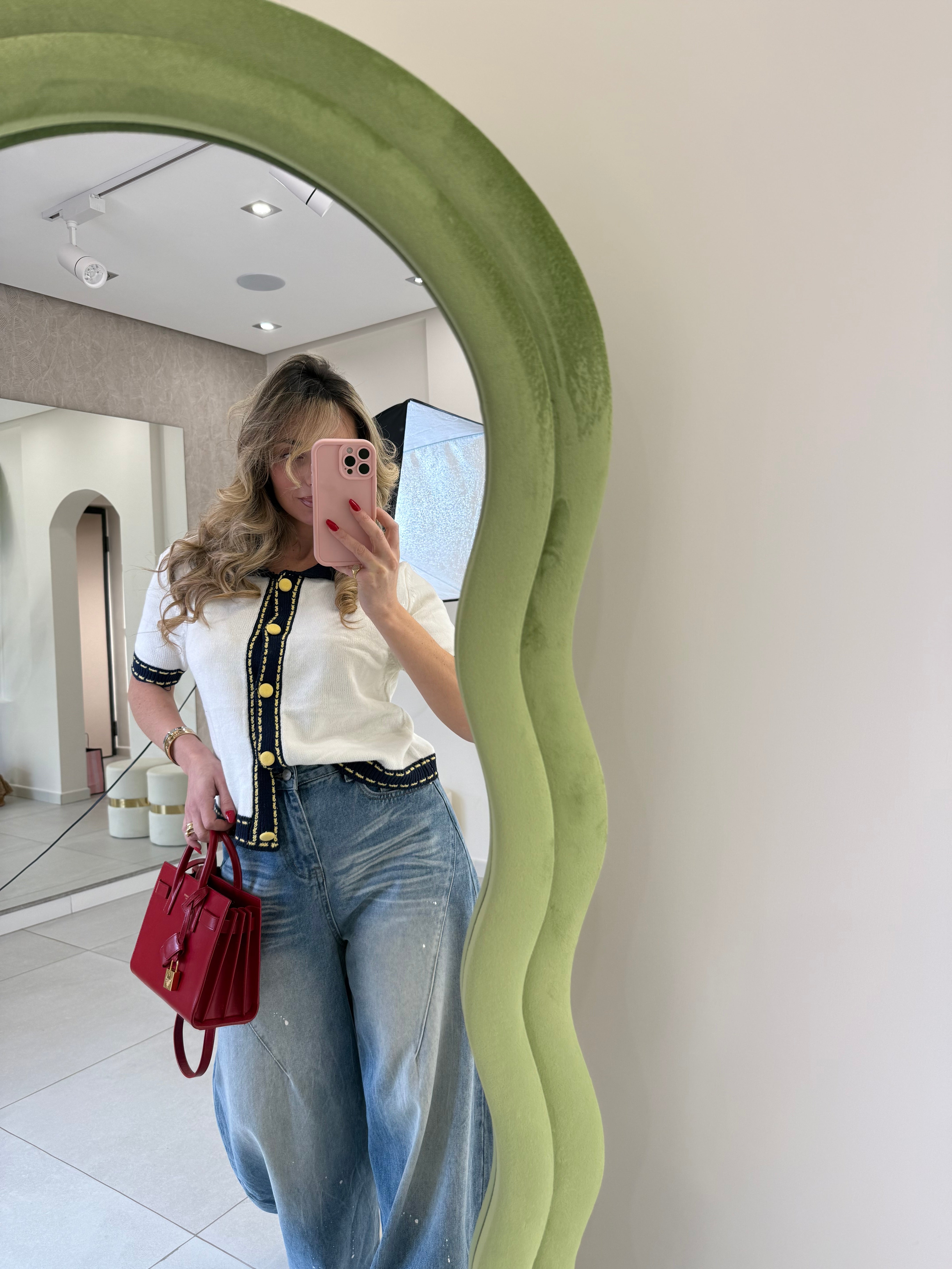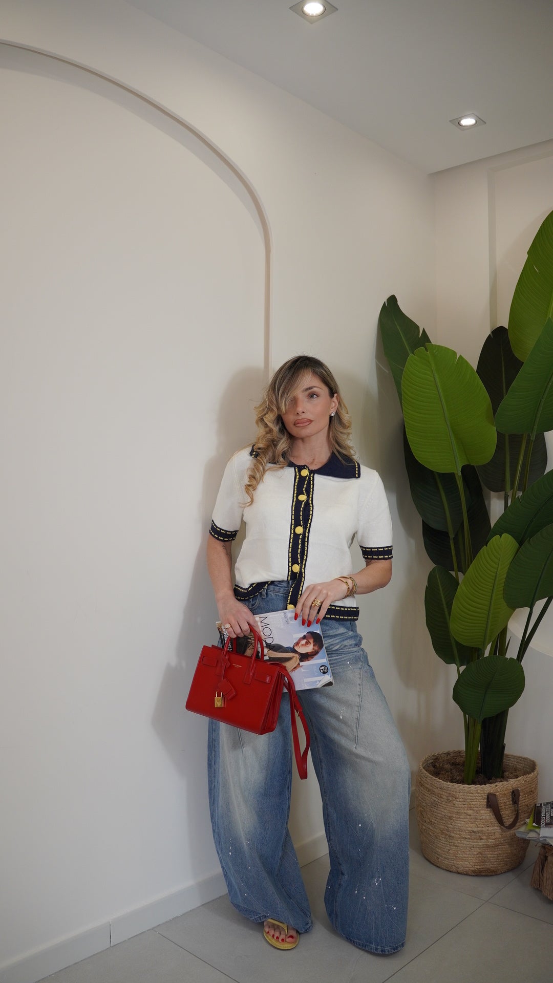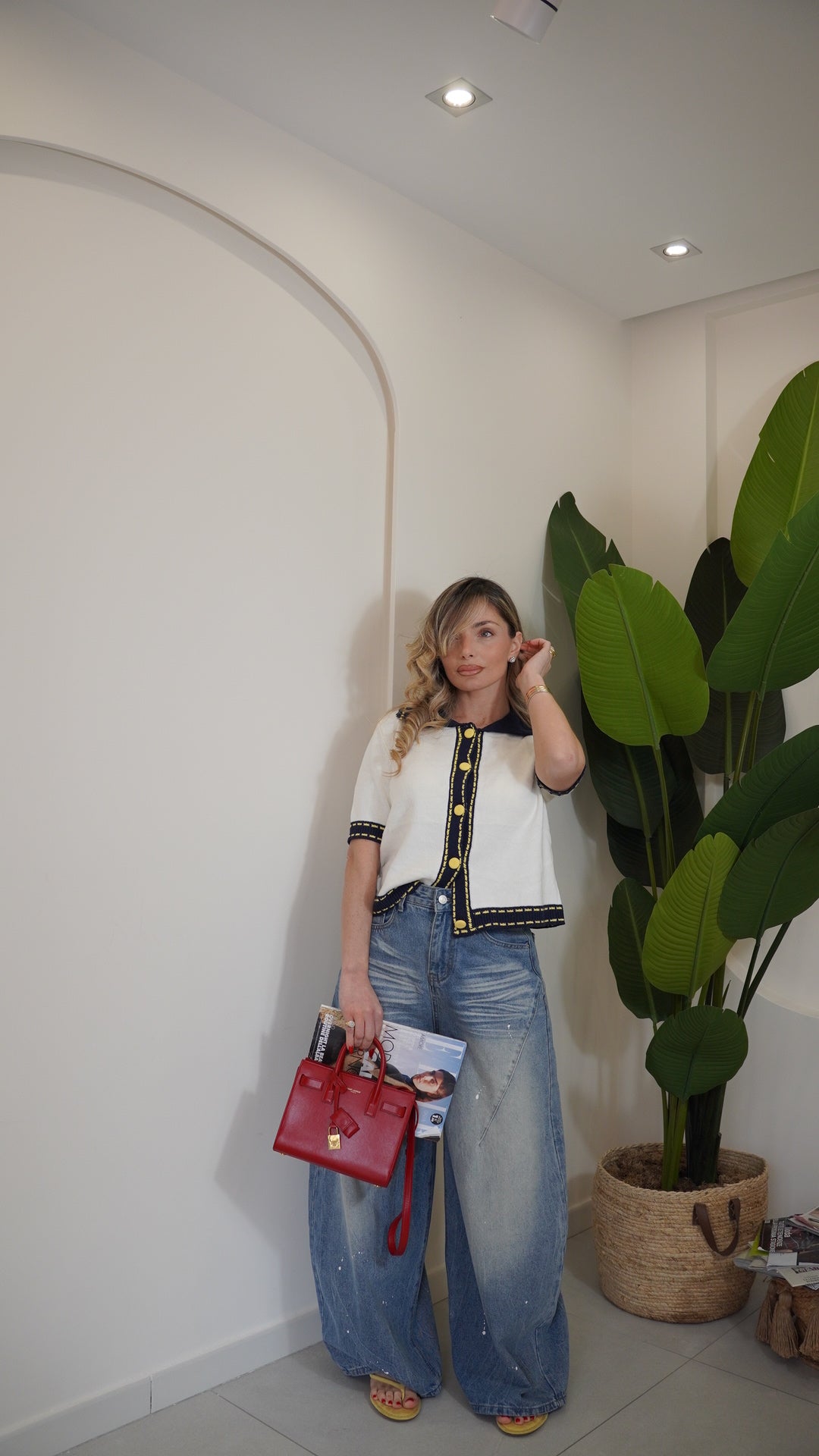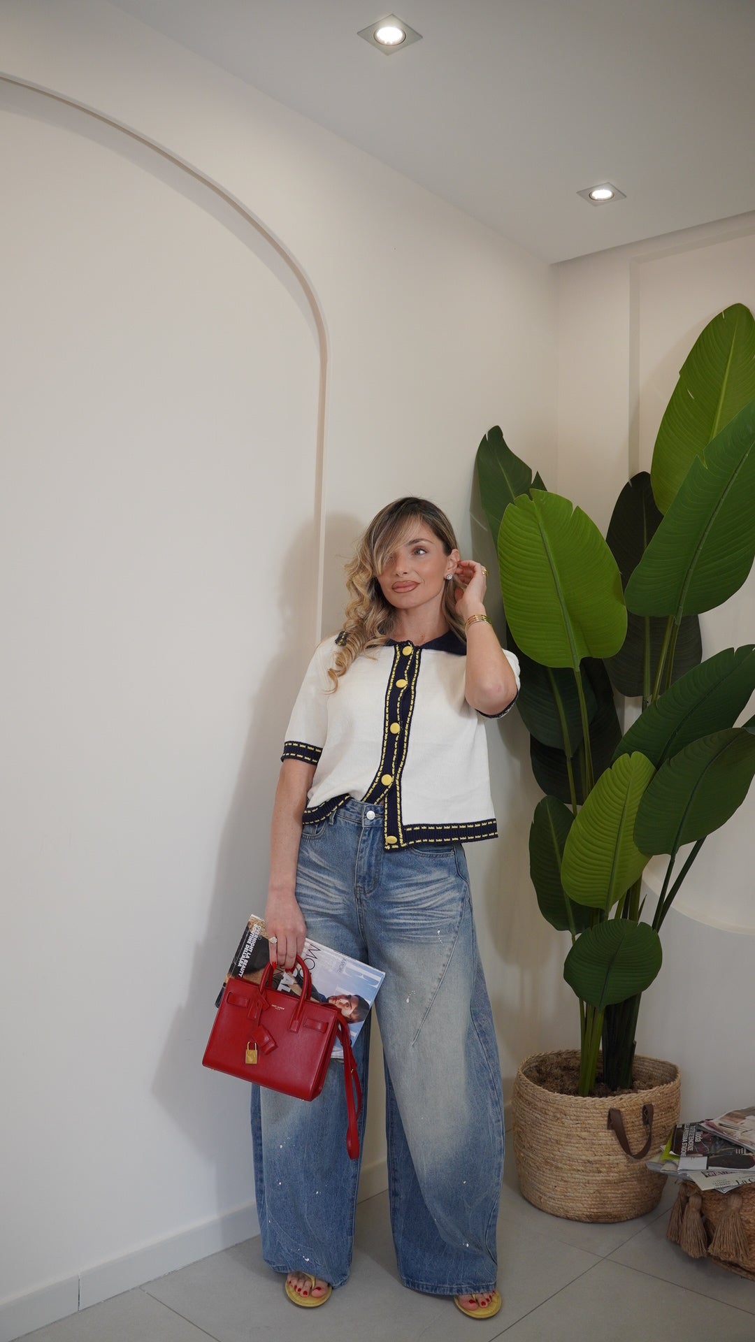 Maglia in filo mezza manica taglia unica con colletto a contrasto in maglia a costine chiusura frontale con bottoni tono su tono a contrasto la taglia unica può vestire da una s ad una L