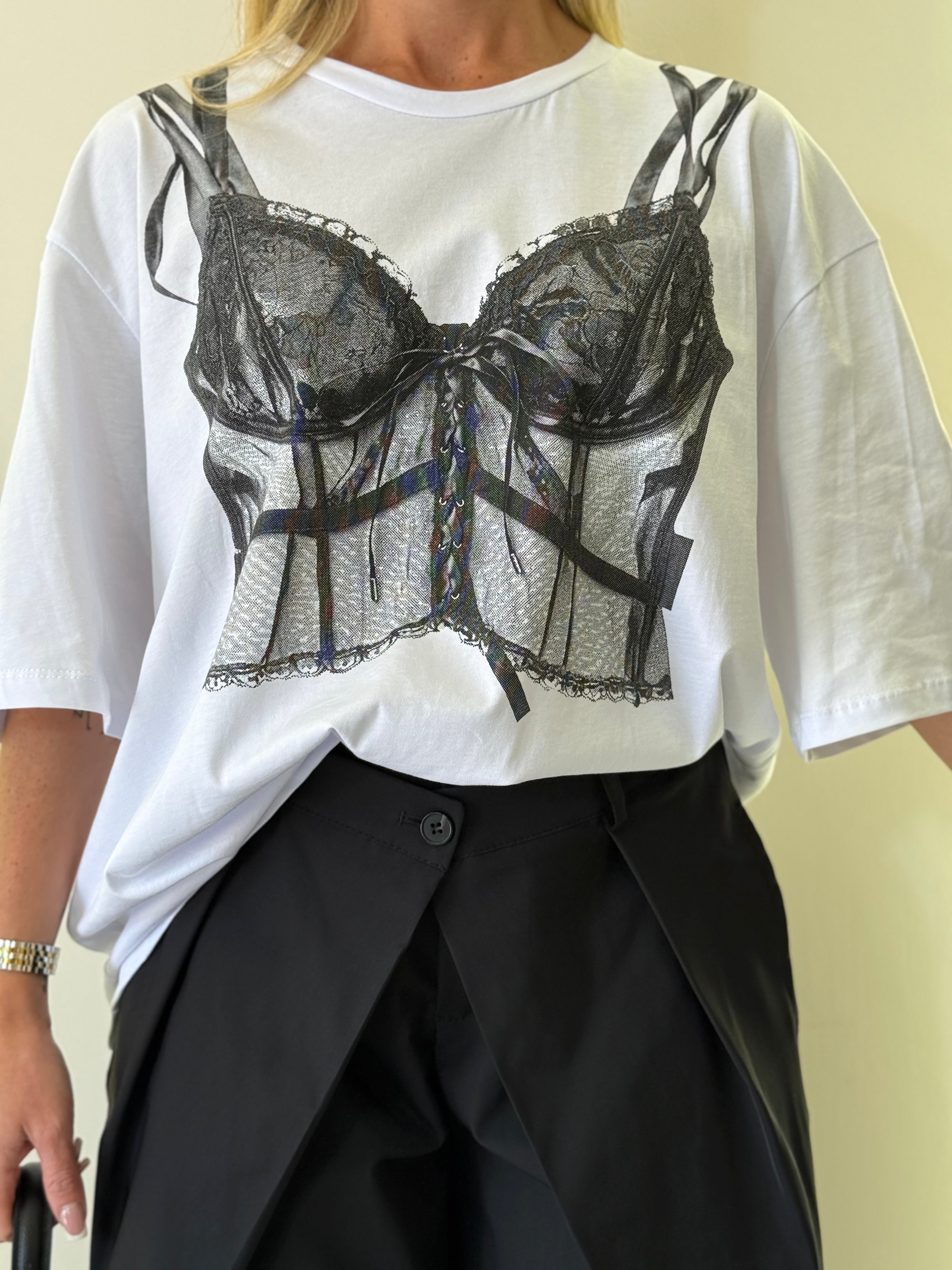 Shirt in cotone premium quality taglia unica con colletto rotondo e stampa sul davanti a contrasto modello over