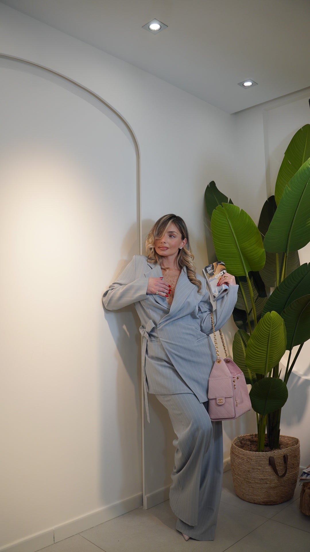 giacca con colletto a reverse con cintura interna integrata chiusura laterale regolabile,pantalone vita alta con elastico in vita gamba larga bustino liscio senza bottoni