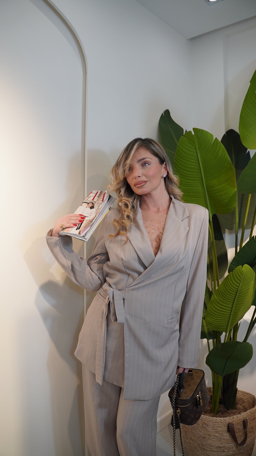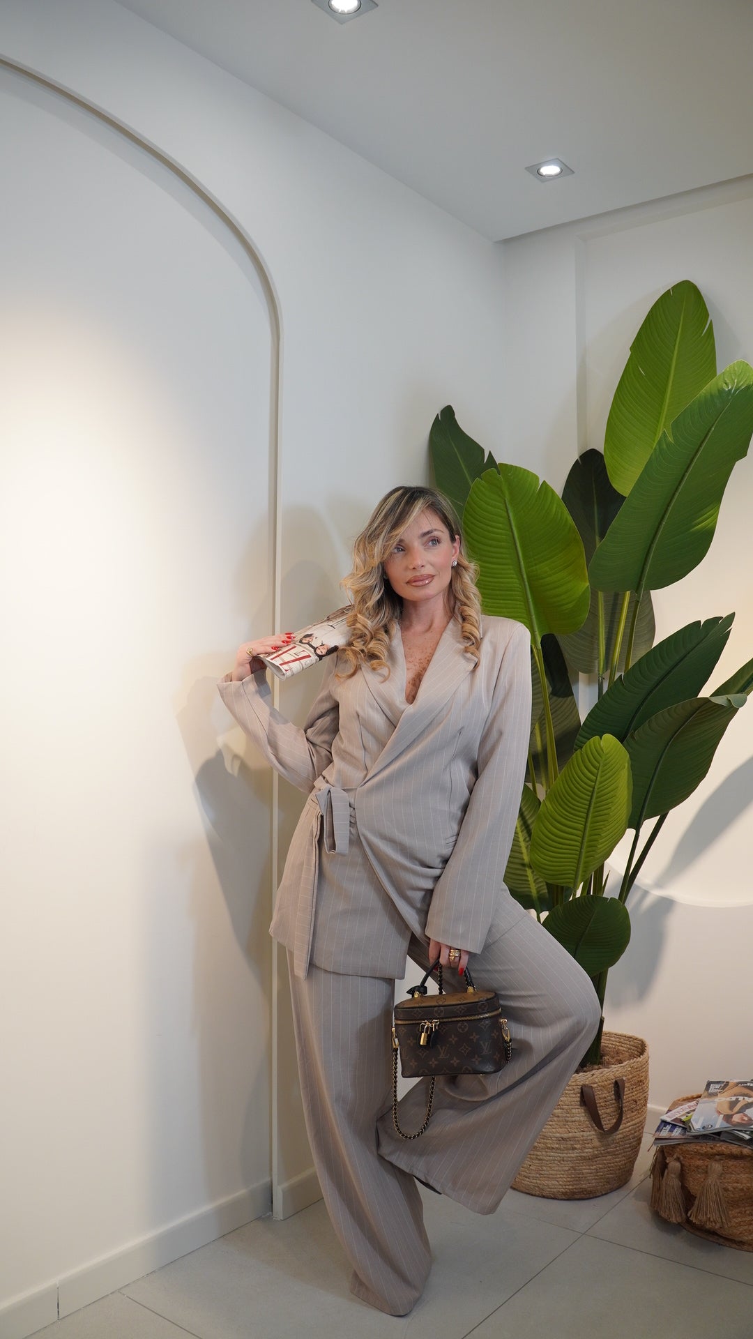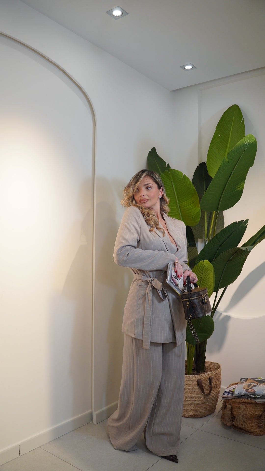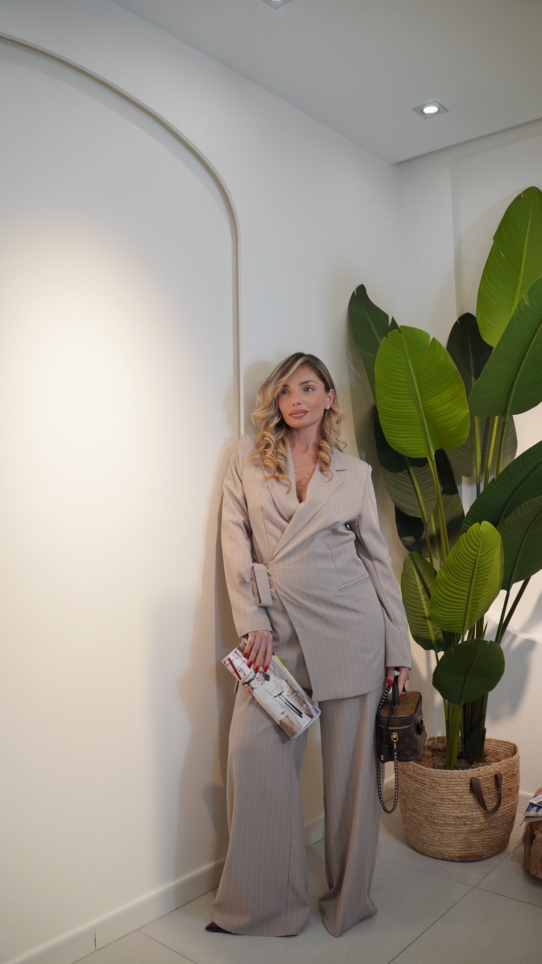 giacca con colletto a reverse con cintura interna integrata chiusura laterale regolabile,pantalone vita alta con elastico in vita gamba larga bustino liscio senza bottoni