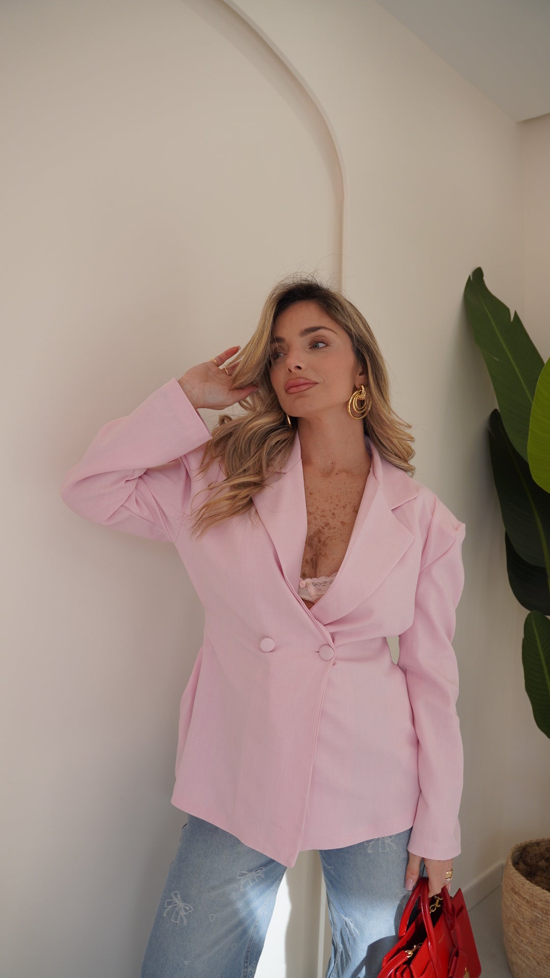 Blazer taglia unica con colletto a reverse spalline imbottite con chiusura frontale doppio petto con bottoni rivestiti tasche ambo laterali e cintura in tessuto integrata in vita